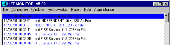 Lift activity, such as a lift being switched to fire service, is logged and time stamped, one line per event. New events are highlighted with a colour coded background and optionally announced with a beep. The Acknowledge menu item clears the colour coded background of the message
