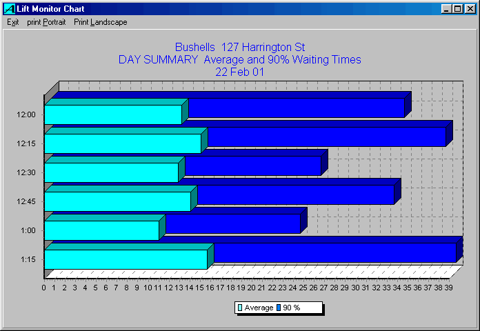 The 'Waiting time by Time of day' report lists the lengths of time people waited at a landing for a lift, grouped into typically 15 minute periods through the day. The 'Waiting time by Floor' reports group the waiting times for each level in the building. The 'Lift Use and Availability' report provides a summary of how much time each lift was switched to fire service and other special modes during the report period. Lift availability is also reported as the percentage of the total time that the lift was available for building service, ie not switched off for maintenance or broken down. The 'Event List' provides a detailed list of when the lifts were used in special service modes and when and where any long waiting times occurred.