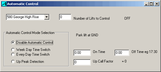 The Automatic Control window augments the manual control facility by adding time control and building traffic peak detection.