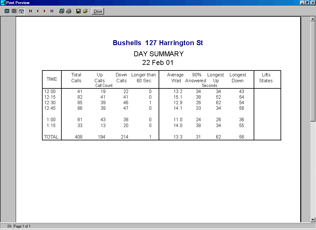Use the check boxes to narrow the report to a particular time of day, or only one floor, or only down calls.